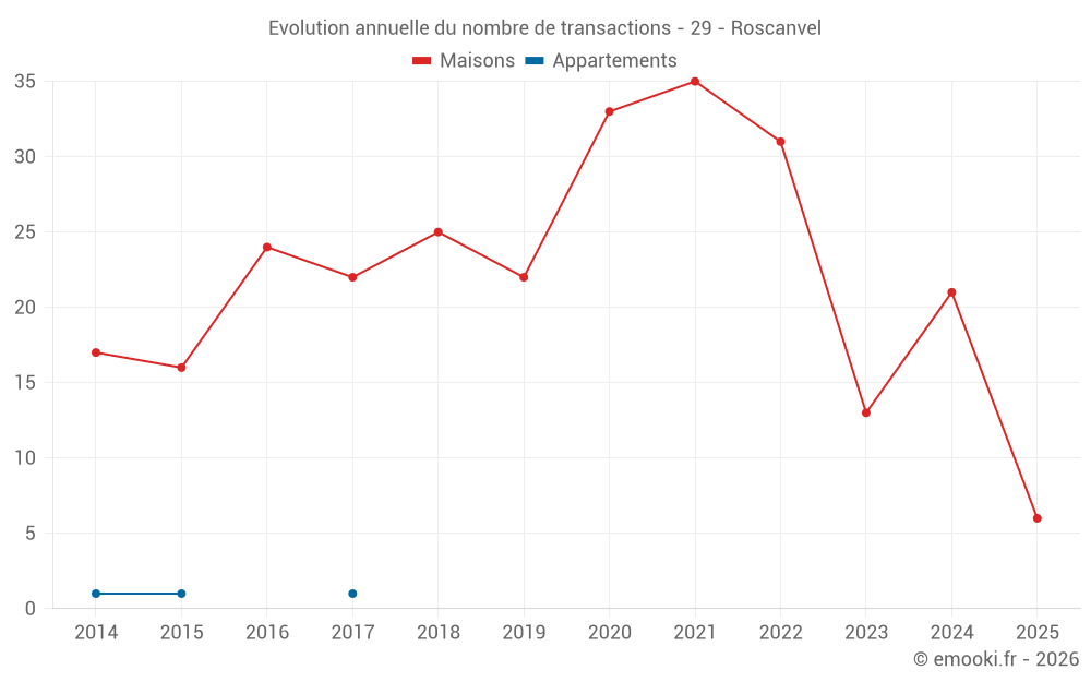 Le prix médian sur les 19 transactions de maisons des 12 derniers mois dans la commune de Roscanvel était de 2 273 € par mètre carré pour une valeur foncière médiane de 220 000 €. Sur cette période 60% des transactions se sont situées entre 1 580 et 2 946 € par mètre carré (du 2ème au 8ème déciles).
