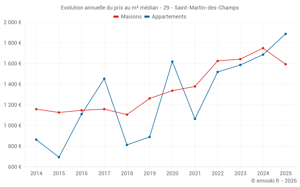 Le prix médian sur les 20 transactions d'appartements des 24 derniers mois dans la commune de Saint-Martin-des-Champs était de 1 808 € par mètre carré pour une valeur foncière médiane de 90 000 €. Sur cette période 60% des transactions se sont situées entre 1 158 et 2 425 € par mètre carré (du 2ème au 8ème déciles).