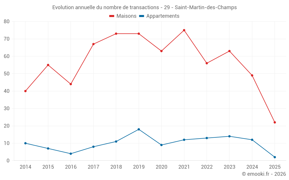 Le prix médian sur les 22 transactions de maisons des 6 derniers mois dans la commune de Saint-Martin-des-Champs était de 1 594 € par mètre carré pour une valeur foncière médiane de 145 050 €. Sur cette période 60% des transactions se sont situées entre 1 218 et 2 328 € par mètre carré (du 2ème au 8ème déciles).