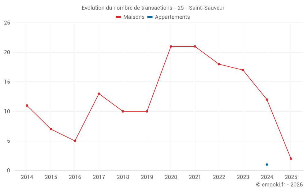 Le prix médian sur les 22 transactions de maisons des 24 derniers mois dans la commune de Saint-Sauveur était de 1 038 € par mètre carré pour une valeur foncière médiane de 105 000 €. Sur cette période 60% des transactions se sont situées entre 753 et 1 610 € par mètre carré (du 2ème au 8ème déciles).