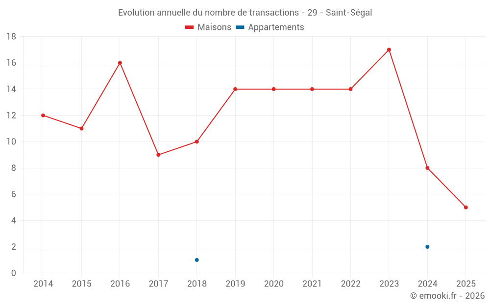 Le prix médian sur les 25 transactions de maisons des 24 derniers mois dans la commune de Saint-Ségal était de 1 569 € par mètre carré pour une valeur foncière médiane de 150 000 €. Sur cette période 60% des transactions se sont situées entre 749 et 2 278 € par mètre carré (du 2ème au 8ème déciles).