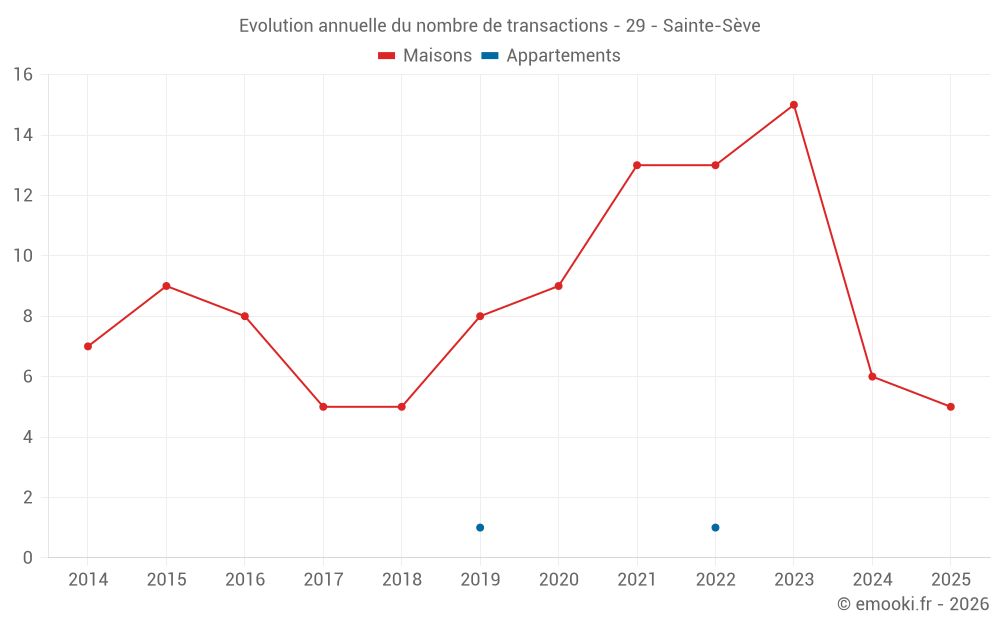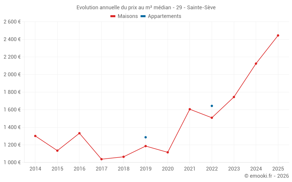 Le prix médian sur les 16 transactions de maisons des 24 derniers mois dans la commune de Sainte-Sève était de 2 124 € par mètre carré pour une valeur foncière médiane de 207 000 €. Sur cette période 60% des transactions se sont situées entre 1 694 et 2 506 € par mètre carré (du 2ème au 8ème déciles).