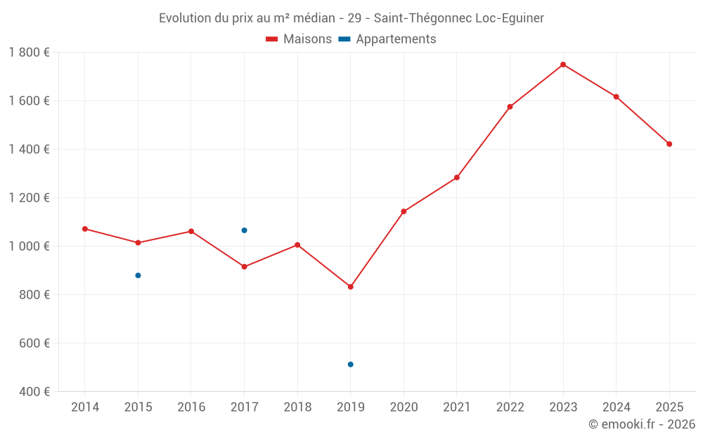 Le prix médian sur les 35 transactions de maisons des 12 derniers mois dans la commune de Saint-Thégonnec Loc-Eguiner était de 1 833 € par mètre carré pour une valeur foncière médiane de 170 250 €. Sur cette période 60% des transactions se sont situées entre 1 004 et 2 282 € par mètre carré (du 2ème au 8ème déciles).