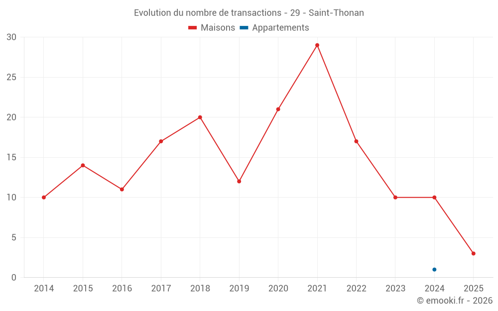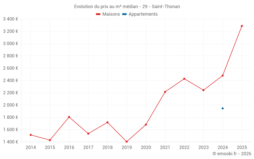 Le prix médian sur les 17 transactions de maisons des 24 derniers mois dans la commune de Saint-Thonan était de 2 459 € par mètre carré pour une valeur foncière médiane de 285 000 €. Sur cette période 60% des transactions se sont situées entre 2 188 et 2 993 € par mètre carré (du 2ème au 8ème déciles).