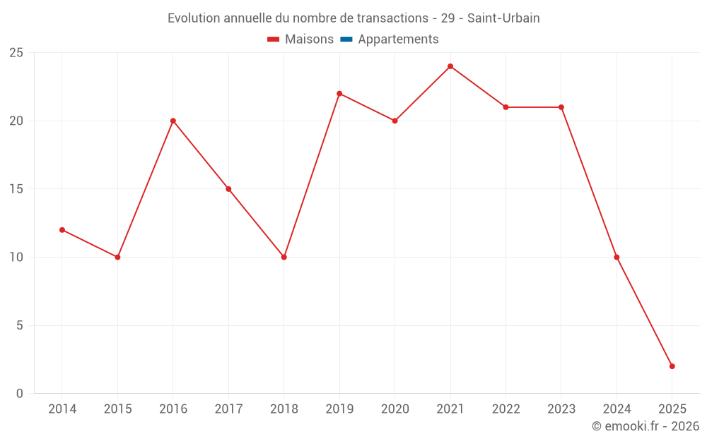 Le prix médian sur les 22 transactions de maisons des 24 derniers mois dans la commune de Saint-Urbain était de 2 150 € par mètre carré pour une valeur foncière médiane de 219 550 €. Sur cette période 60% des transactions se sont situées entre 1 696 et 2 727 € par mètre carré (du 2ème au 8ème déciles).