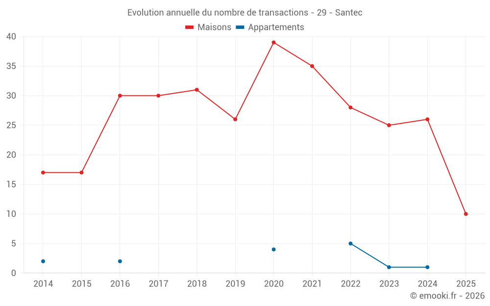 Le prix médian sur les 23 transactions de maisons des 12 derniers mois dans la commune de Santec était de 2 811 € par mètre carré pour une valeur foncière médiane de 237 100 €. Sur cette période 60% des transactions se sont situées entre 2 190 et 3 671 € par mètre carré (du 2ème au 8ème déciles).