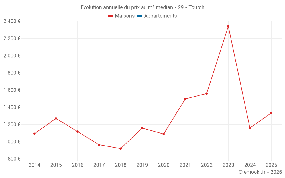 Le prix médian sur les 16 transactions de maisons des 24 derniers mois dans la commune de Tourch était de 1 246 € par mètre carré pour une valeur foncière médiane de 122 500 €. Sur cette période 60% des transactions se sont situées entre 947 et 1 945 € par mètre carré (du 2ème au 8ème déciles).