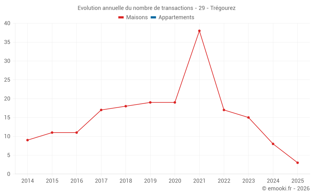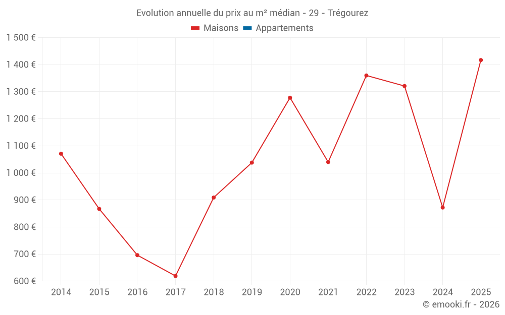 Le prix médian sur les 16 transactions de maisons des 24 derniers mois dans la commune de Trégourez était de 1 144 € par mètre carré pour une valeur foncière médiane de 72 674 €. Sur cette période 60% des transactions se sont situées entre 618 et 1 368 € par mètre carré (du 2ème au 8ème déciles).