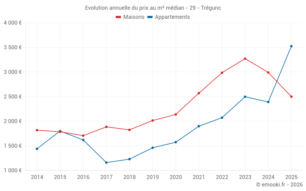 Le prix médian sur les 25 transactions de maisons des 6 derniers mois dans la commune de Trégunc était de 2 500 € par mètre carré pour une valeur foncière médiane de 240 000 €. Sur cette période 60% des transactions se sont situées entre 1 675 et 3 276 € par mètre carré (du 2ème au 8ème déciles).