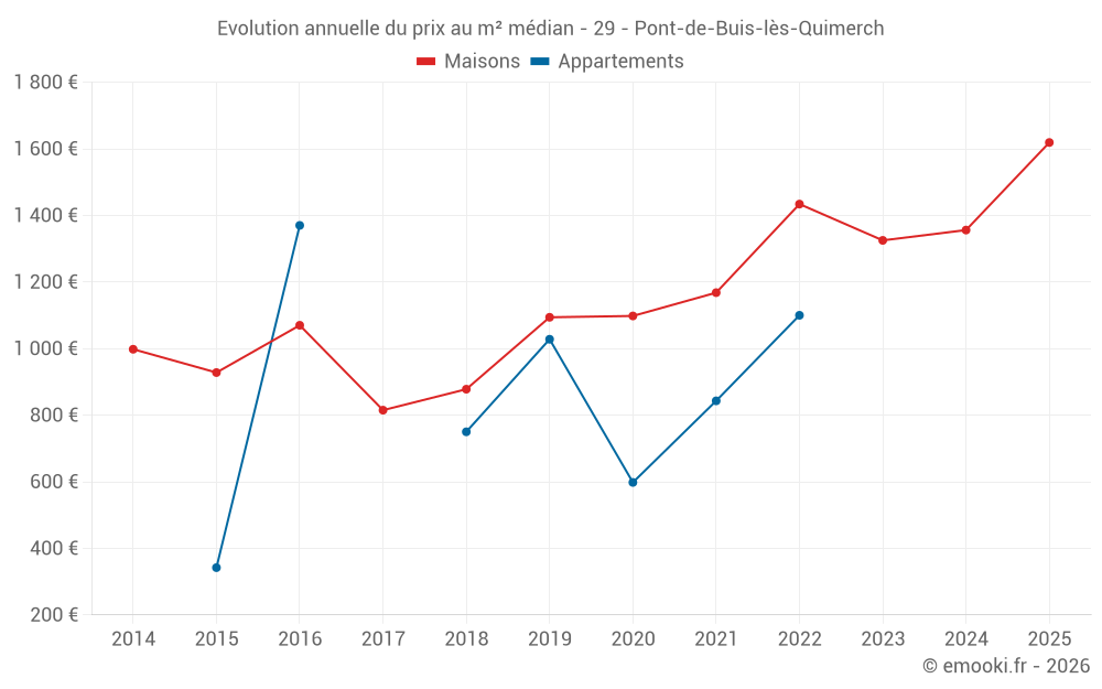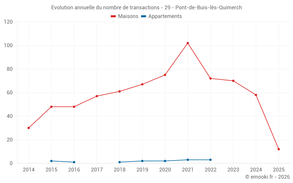 Le prix médian sur les 44 transactions de maisons des 12 derniers mois dans la commune de Pont-de-Buis-lès-Quimerch était de 1 528 € par mètre carré pour une valeur foncière médiane de 112 500 €. Sur cette période 60% des transactions se sont situées entre 975 et 2 029 € par mètre carré (du 2ème au 8ème déciles).