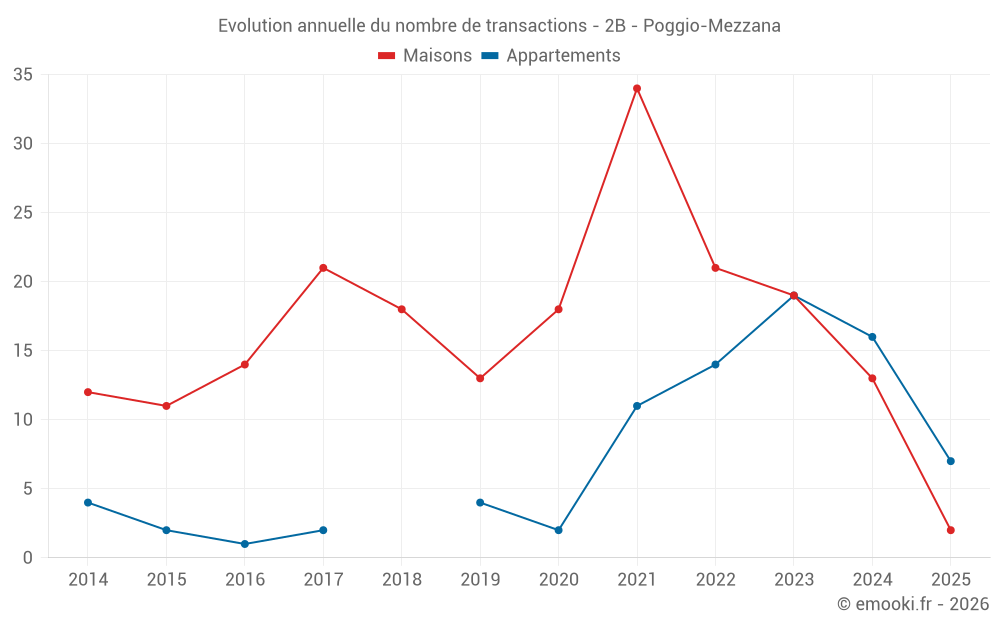 Le prix médian sur les 18 transactions de maisons des 24 derniers mois dans la commune de Poggio-Mezzana était de 3 256 € par mètre carré pour une valeur foncière médiane de 151 000 €. Sur cette période 60% des transactions se sont situées entre 2 261 et 4 234 € par mètre carré (du 2ème au 8ème déciles).