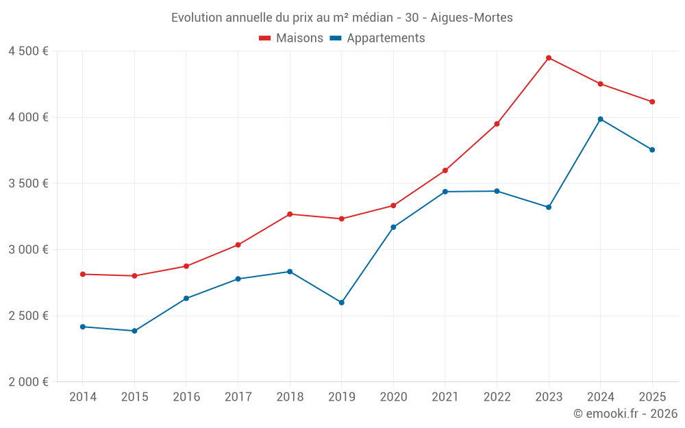 Le prix médian sur les 30 transactions de maisons des 3 derniers mois dans la commune d'Aigues-Mortes était de 4 340 € par mètre carré pour une valeur foncière médiane de 343 625 €. Sur cette période 60% des transactions se sont situées entre 3 522 et 5 496 € par mètre carré (du 2ème au 8ème déciles).