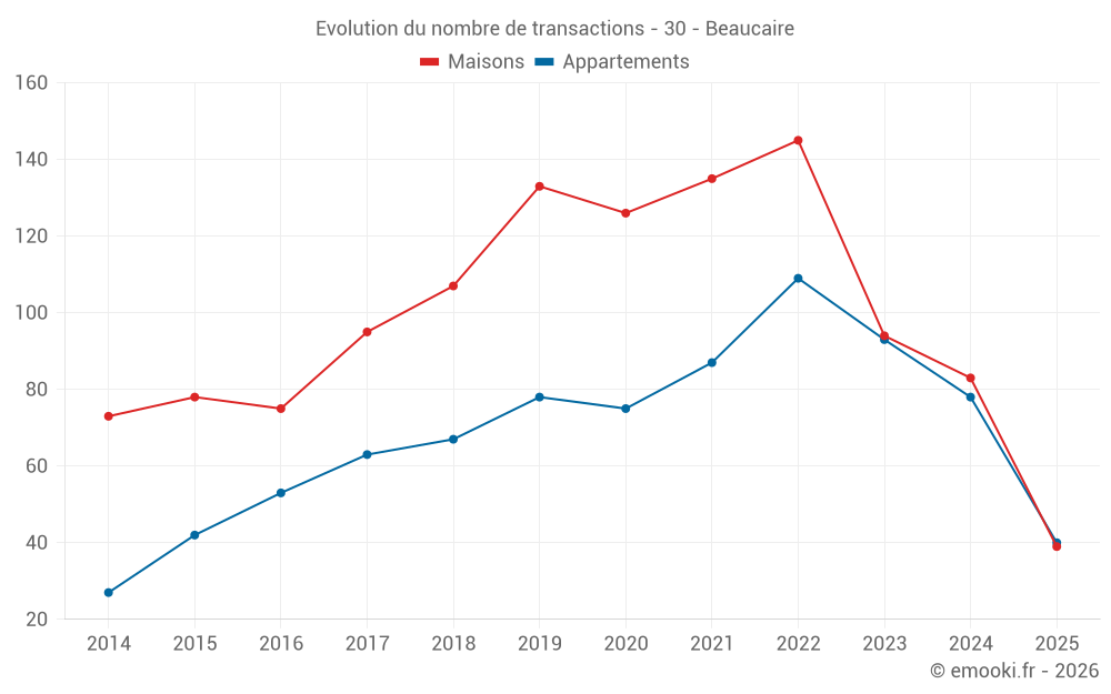 Le prix médian sur les 39 transactions de maisons des 6 derniers mois dans la commune de Beaucaire était de 2 239 € par mètre carré pour une valeur foncière médiane de 200 000 €. Sur cette période 60% des transactions se sont situées entre 1 370 et 2 851 € par mètre carré (du 2ème au 8ème déciles).
