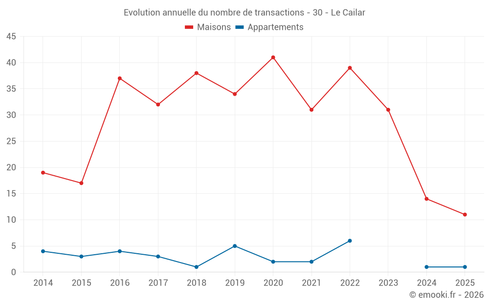 Le prix médian sur les 21 transactions de maisons des 12 derniers mois dans la commune du Cailar était de 3 254 € par mètre carré pour une valeur foncière médiane de 310 000 €. Sur cette période 60% des transactions se sont situées entre 2 444 et 3 736 € par mètre carré (du 2ème au 8ème déciles).