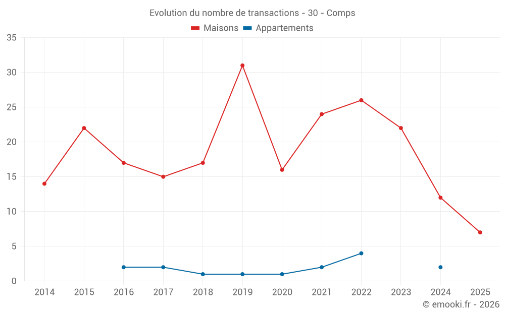 Le prix médian sur les 29 transactions de maisons des 24 derniers mois dans la commune de Comps était de 2 672 € par mètre carré pour une valeur foncière médiane de 252 000 €. Sur cette période 60% des transactions se sont situées entre 1 759 et 3 106 € par mètre carré (du 2ème au 8ème déciles).