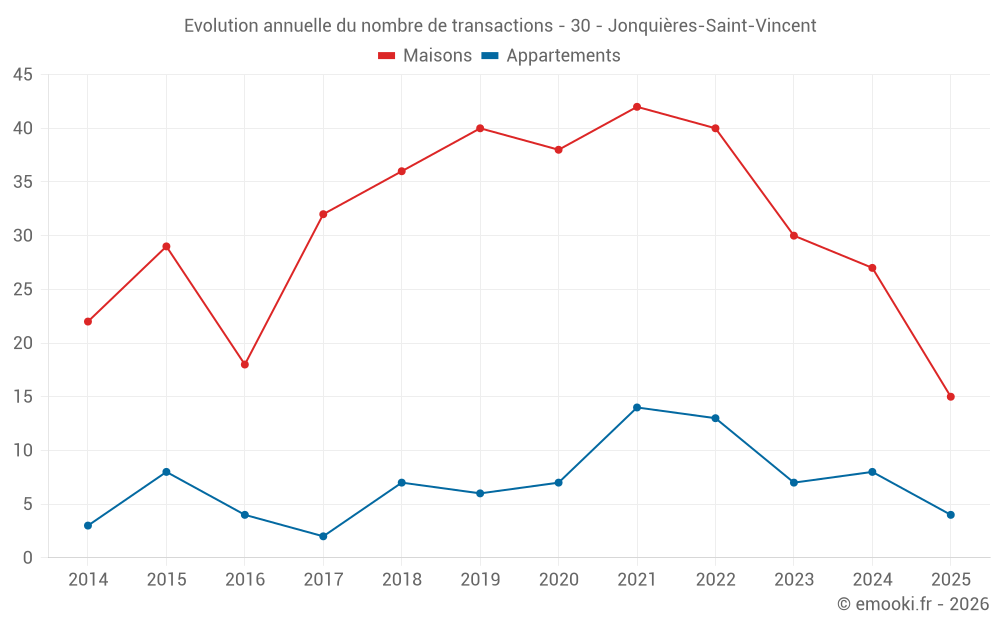 Le prix médian sur les 29 transactions de maisons des 12 derniers mois dans la commune de Jonquières-Saint-Vincent était de 2 369 € par mètre carré pour une valeur foncière médiane de 230 000 €. Sur cette période 60% des transactions se sont situées entre 1 421 et 2 923 € par mètre carré (du 2ème au 8ème déciles).
