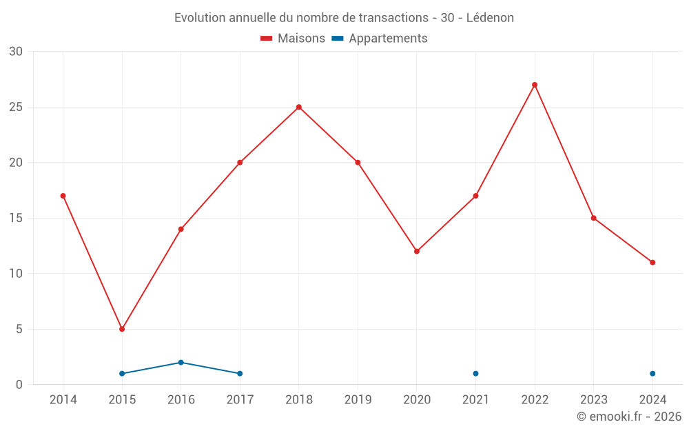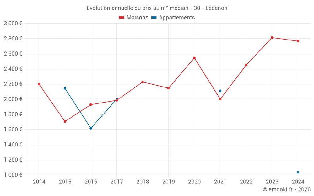 Le prix médian sur les 21 transactions de maisons des 24 derniers mois dans la commune de Lédenon était de 2 640 € par mètre carré pour une valeur foncière médiane de 260 000 €. Sur cette période 60% des transactions se sont situées entre 1 736 et 2 837 € par mètre carré (du 2ème au 8ème déciles).