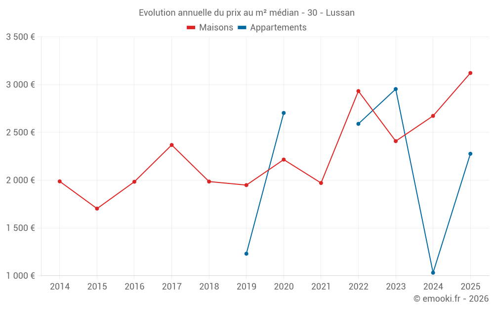 Le prix médian sur les 19 transactions de maisons des 24 derniers mois dans la commune de Lussan était de 3 100 € par mètre carré pour une valeur foncière médiane de 294 500 €. Sur cette période 60% des transactions se sont situées entre 2 362 et 3 779 € par mètre carré (du 2ème au 8ème déciles).