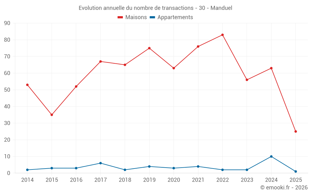 Le prix médian sur les 25 transactions de maisons des 6 derniers mois dans la commune de Manduel était de 2 781 € par mètre carré pour une valeur foncière médiane de 300 000 €. Sur cette période 60% des transactions se sont situées entre 2 277 et 3 417 € par mètre carré (du 2ème au 8ème déciles).