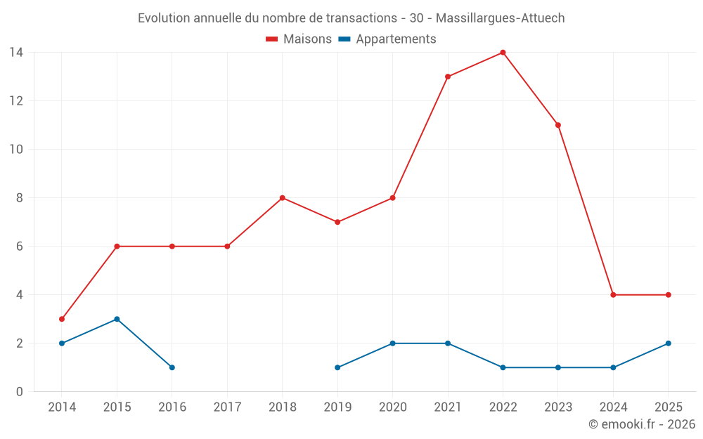 Le prix médian sur les 16 transactions de maisons des 24 derniers mois dans la commune de Massillargues-Attuech était de 2 165 € par mètre carré pour une valeur foncière médiane de 202 550 €. Sur cette période 60% des transactions se sont situées entre 1 622 et 2 561 € par mètre carré (du 2ème au 8ème déciles).