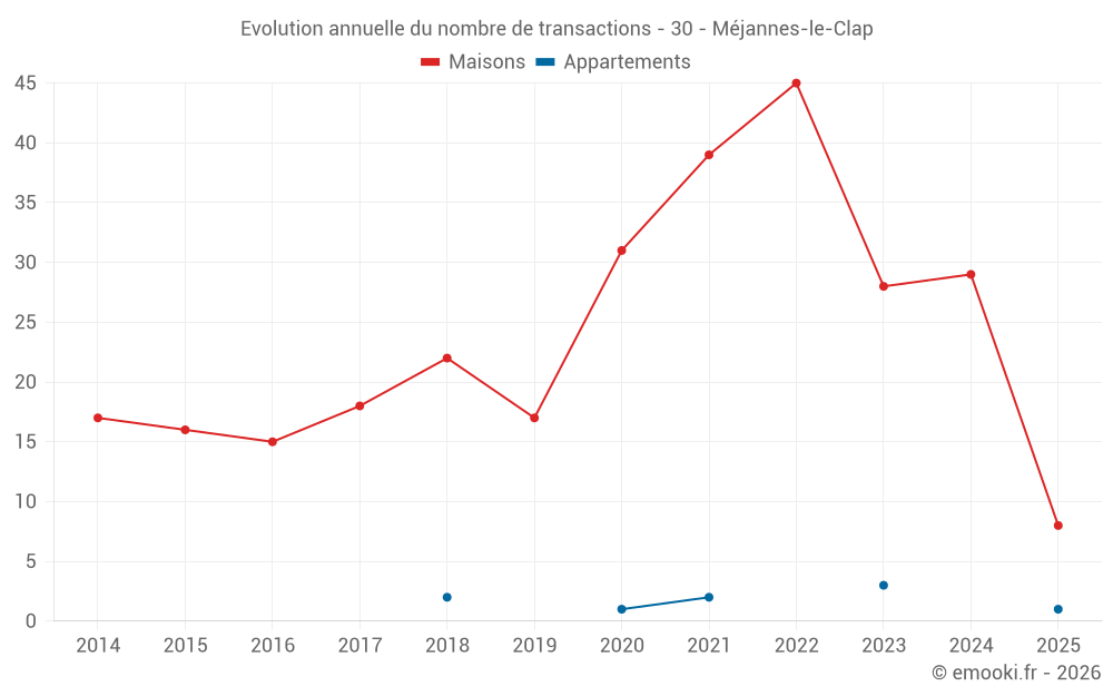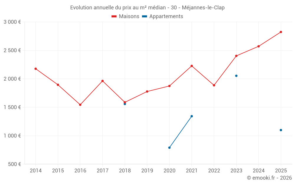 Le prix médian sur les 22 transactions de maisons des 12 derniers mois dans la commune de Méjannes-le-Clap était de 2 664 € par mètre carré pour une valeur foncière médiane de 146 625 €. Sur cette période 60% des transactions se sont situées entre 1 923 et 3 547 € par mètre carré (du 2ème au 8ème déciles).