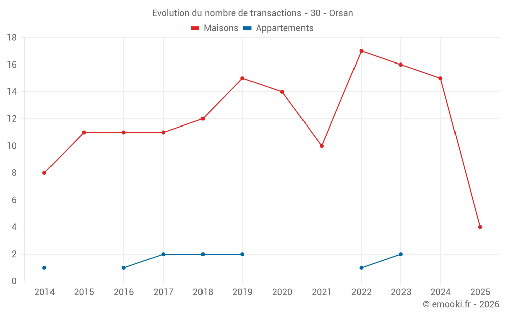 Le prix médian sur les 25 transactions de maisons des 24 derniers mois dans la commune d'Orsan était de 2 098 € par mètre carré pour une valeur foncière médiane de 193 000 €. Sur cette période 60% des transactions se sont situées entre 1 541 et 2 872 € par mètre carré (du 2ème au 8ème déciles).