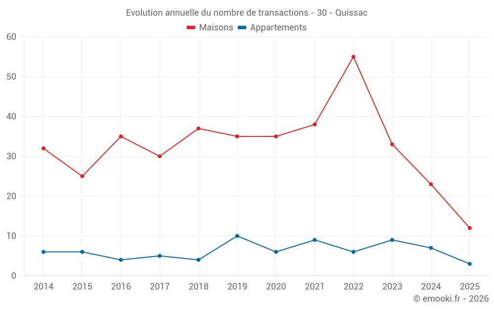 Le prix médian sur les 25 transactions de maisons des 12 derniers mois dans la commune de Quissac était de 2 240 € par mètre carré pour une valeur foncière médiane de 210 000 €. Sur cette période 60% des transactions se sont situées entre 1 412 et 2 924 € par mètre carré (du 2ème au 8ème déciles).