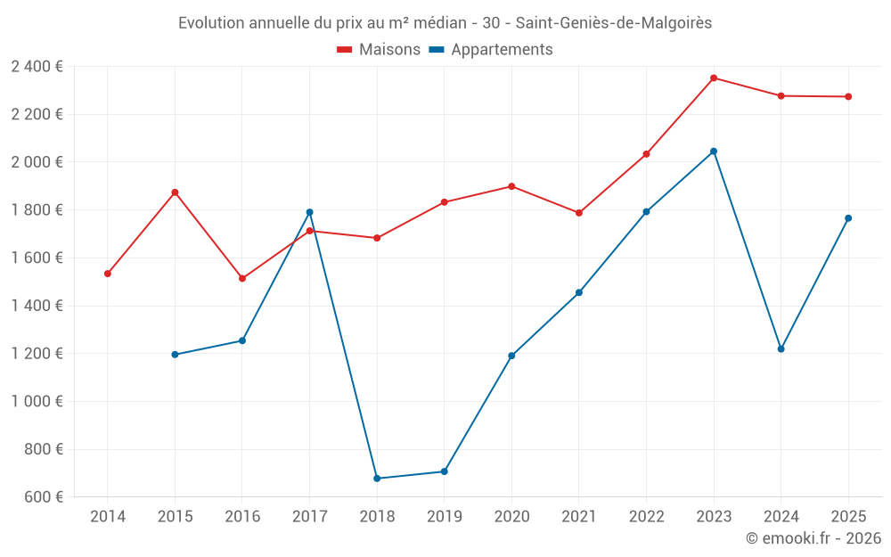 Le prix médian sur les 20 transactions de maisons des 12 derniers mois dans la commune de Saint-Geniès-de-Malgoirès était de 2 346 € par mètre carré pour une valeur foncière médiane de 178 500 €. Sur cette période 60% des transactions se sont situées entre 1 720 et 2 682 € par mètre carré (du 2ème au 8ème déciles).