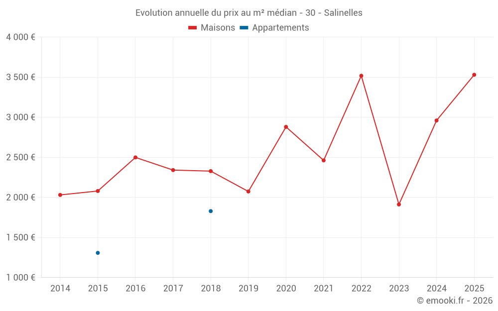 Le prix médian sur les 14 transactions de maisons des 24 derniers mois dans la commune de Salinelles était de 2 960 € par mètre carré pour une valeur foncière médiane de 246 600 €. Sur cette période 60% des transactions se sont situées entre 2 108 et 3 497 € par mètre carré (du 2ème au 8ème déciles).