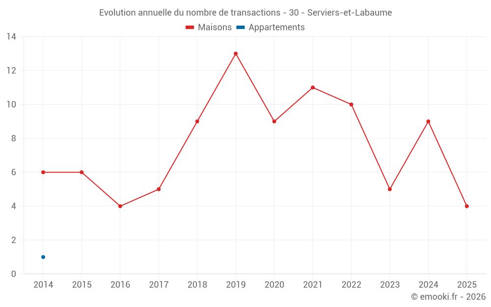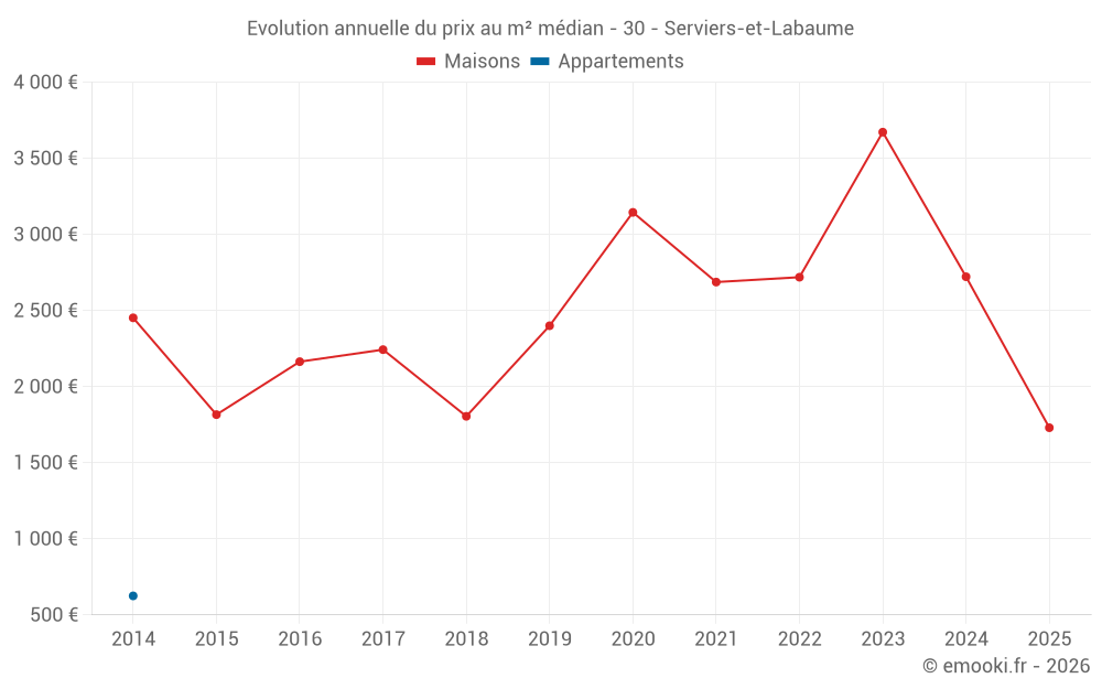 Le prix médian sur les 15 transactions de maisons des 24 derniers mois dans la commune de Serviers-et-Labaume était de 2 722 € par mètre carré pour une valeur foncière médiane de 260 000 €. Sur cette période 60% des transactions se sont situées entre 1 762 et 3 896 € par mètre carré (du 2ème au 8ème déciles).