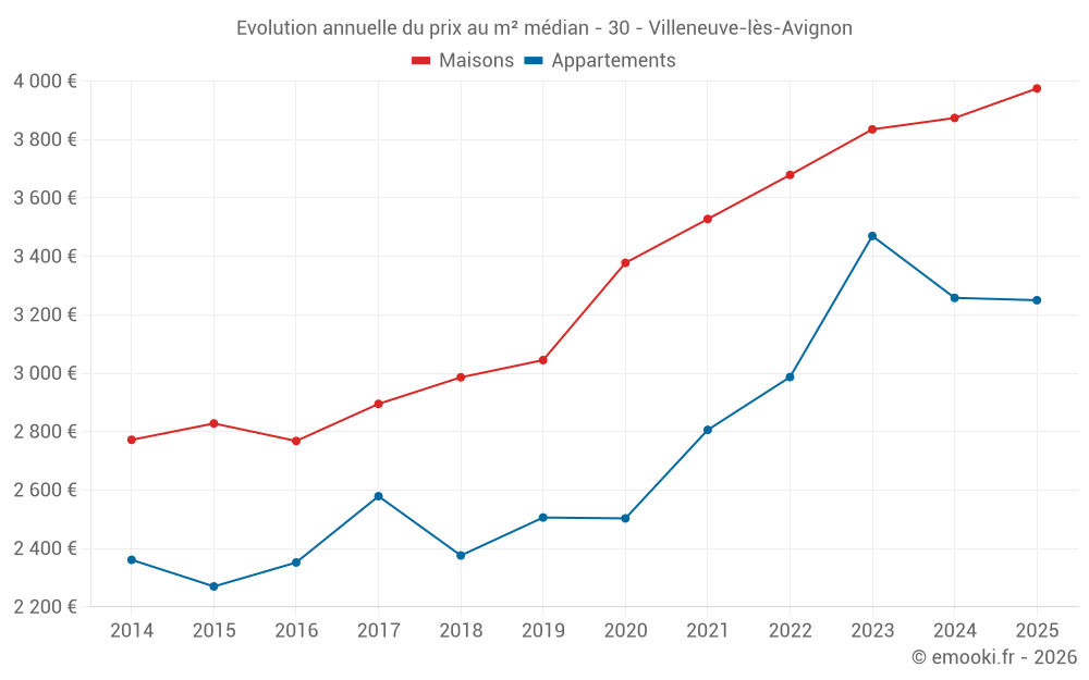 Le prix médian sur les 21 transactions de maisons des 3 derniers mois dans la commune de Villeneuve-lès-Avignon était de 3 975 € par mètre carré pour une valeur foncière médiane de 394 950 €. Sur cette période 60% des transactions se sont situées entre 3 439 et 5 071 € par mètre carré (du 2ème au 8ème déciles).