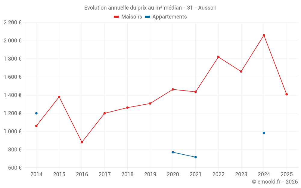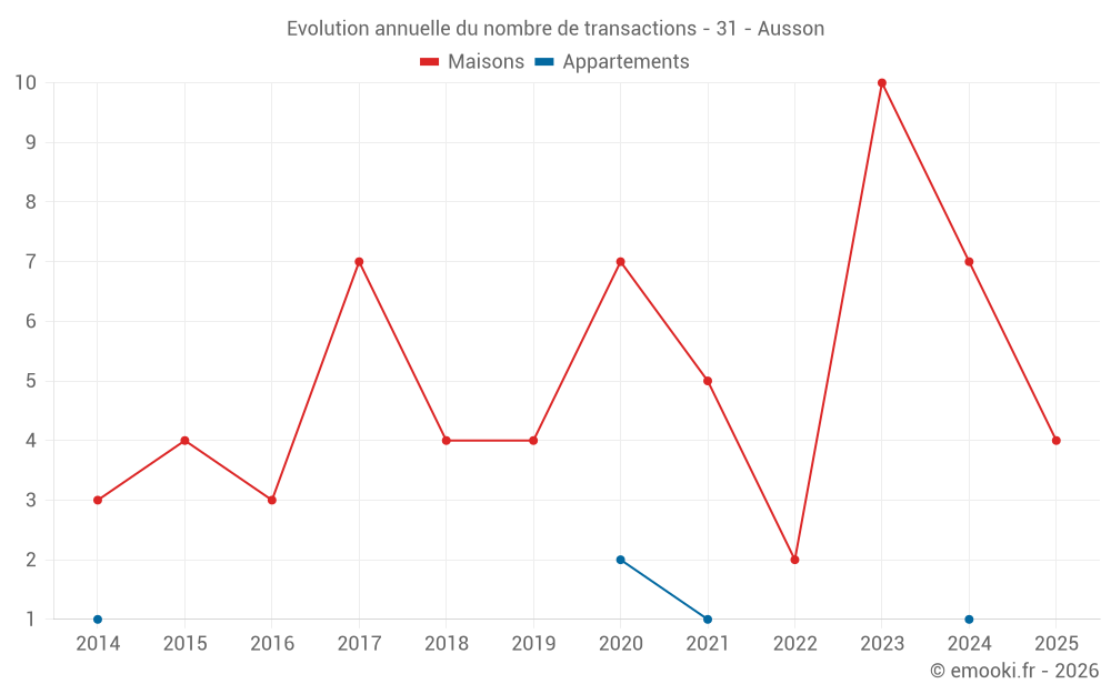 Le prix médian sur les 19 transactions de maisons des 24 derniers mois dans la commune d'Ausson était de 1 718 € par mètre carré pour une valeur foncière médiane de 161 500 €. Sur cette période 60% des transactions se sont situées entre 1 228 et 2 416 € par mètre carré (du 2ème au 8ème déciles).