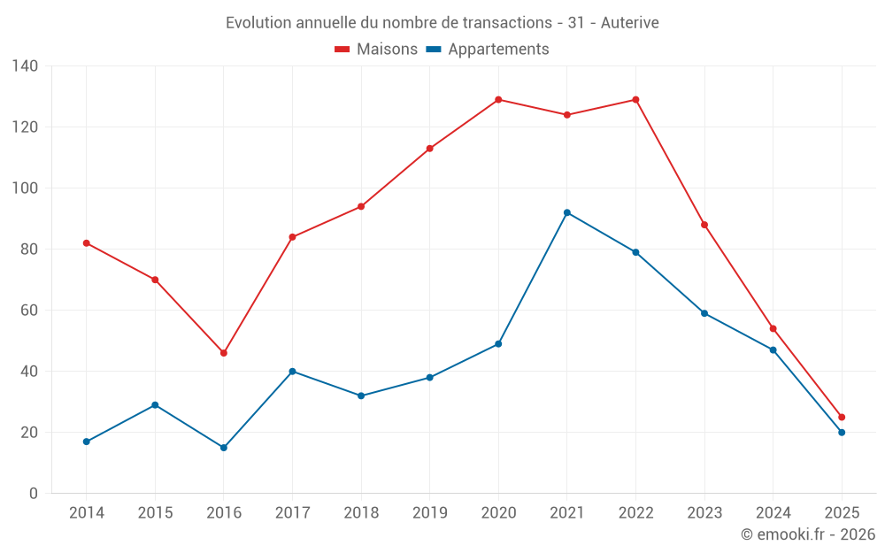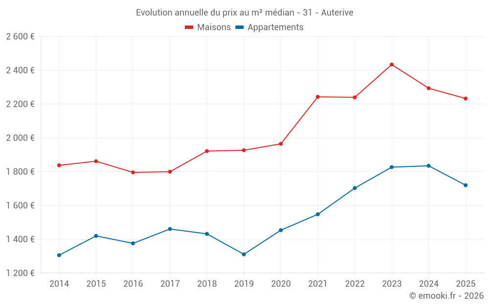 Le prix médian sur les 25 transactions de maisons des 6 derniers mois dans la commune d'Auterive était de 2 233 € par mètre carré pour une valeur foncière médiane de 230 000 €. Sur cette période 60% des transactions se sont situées entre 1 590 et 2 561 € par mètre carré (du 2ème au 8ème déciles).