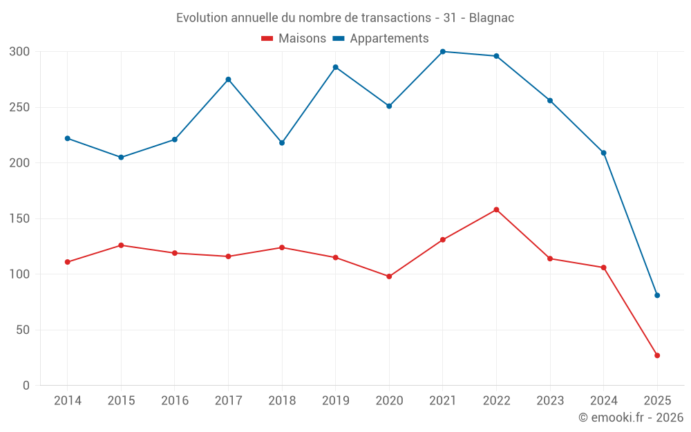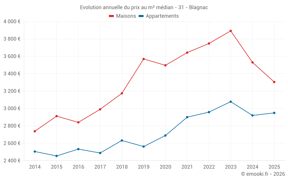 Le prix médian sur les 27 transactions de maisons des 6 derniers mois dans la commune de Blagnac était de 3 304 € par mètre carré pour une valeur foncière médiane de 315 000 €. Sur cette période 60% des transactions se sont situées entre 2 621 et 4 196 € par mètre carré (du 2ème au 8ème déciles).