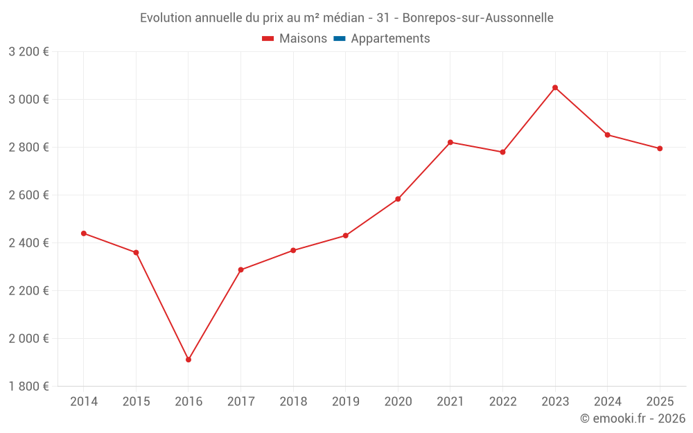 Le prix médian sur les 26 transactions de maisons des 24 derniers mois dans la commune de Bonrepos-sur-Aussonnelle était de 2 923 € par mètre carré pour une valeur foncière médiane de 335 412 €. Sur cette période 60% des transactions se sont situées entre 2 425 et 3 475 € par mètre carré (du 2ème au 8ème déciles).