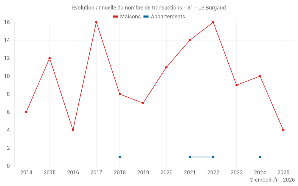 Le prix médian sur les 18 transactions de maisons des 24 derniers mois dans la commune du Burgaud était de 1 764 € par mètre carré pour une valeur foncière médiane de 200 320 €. Sur cette période 60% des transactions se sont situées entre 1 361 et 2 311 € par mètre carré (du 2ème au 8ème déciles).