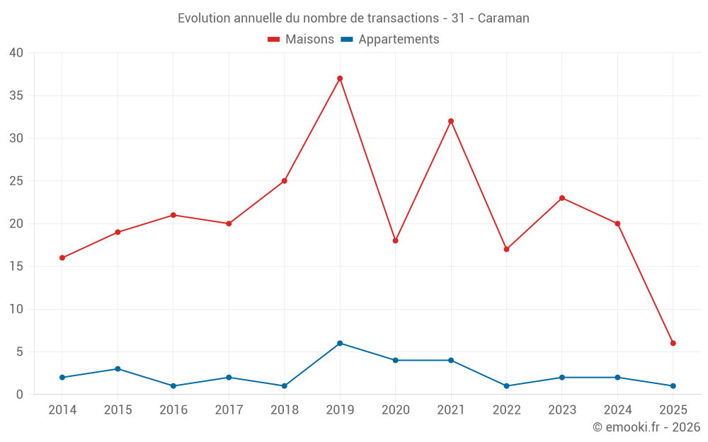 Le prix médian sur les 16 transactions de maisons des 12 derniers mois dans la commune de Caraman était de 2 572 € par mètre carré pour une valeur foncière médiane de 280 750 €. Sur cette période 60% des transactions se sont situées entre 1 500 et 3 111 € par mètre carré (du 2ème au 8ème déciles).