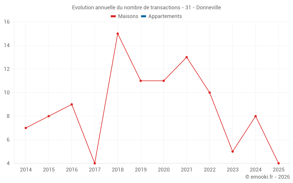 Le prix médian sur les 14 transactions de maisons des 24 derniers mois dans la commune de Donneville était de 2 754 € par mètre carré pour une valeur foncière médiane de 311 495 €. Sur cette période 60% des transactions se sont situées entre 2 302 et 3 504 € par mètre carré (du 2ème au 8ème déciles).