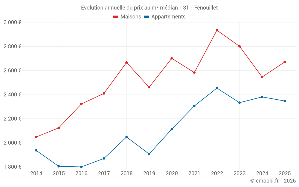 Le prix médian sur les 33 transactions de maisons des 12 derniers mois dans la commune de Fenouillet était de 2 596 € par mètre carré pour une valeur foncière médiane de 269 000 €. Sur cette période 60% des transactions se sont situées entre 2 167 et 3 185 € par mètre carré (du 2ème au 8ème déciles).