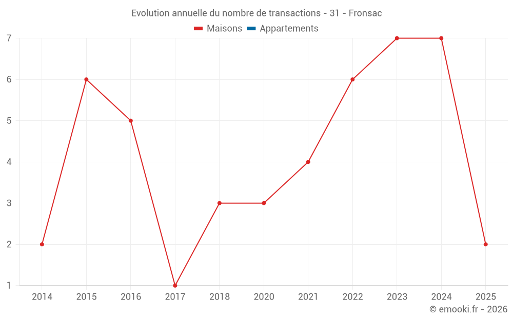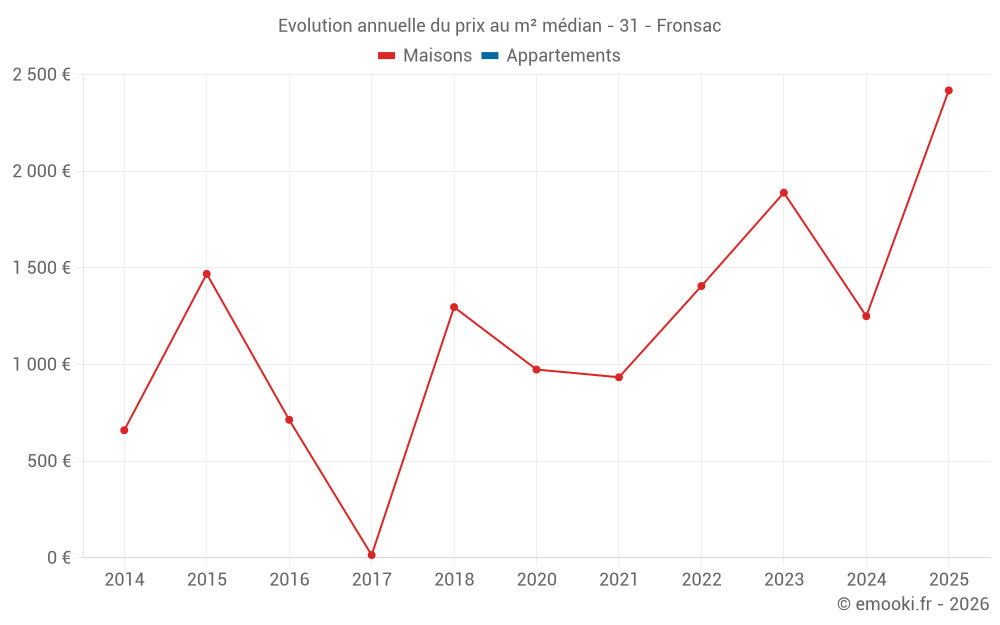 Le prix médian sur les 14 transactions de maisons des 24 derniers mois dans la commune de Fronsac était de 1 692 € par mètre carré pour une valeur foncière médiane de 137 500 €. Sur cette période 60% des transactions se sont situées entre 1 116 et 2 178 € par mètre carré (du 2ème au 8ème déciles).