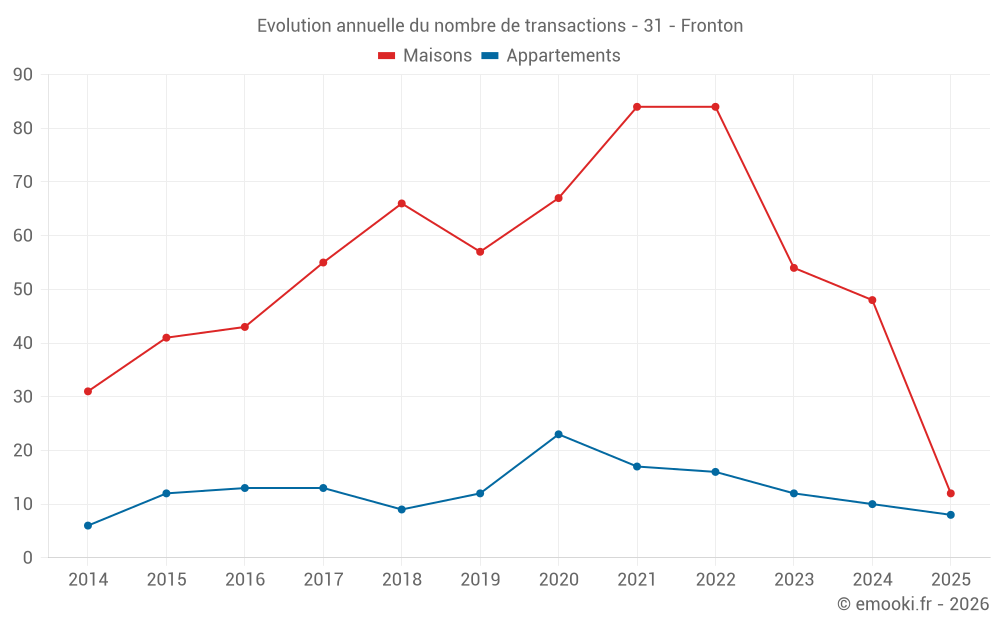 Le prix médian sur les 41 transactions de maisons des 12 derniers mois dans la commune de Fronton était de 2 604 € par mètre carré pour une valeur foncière médiane de 290 000 €. Sur cette période 60% des transactions se sont situées entre 2 016 et 2 898 € par mètre carré (du 2ème au 8ème déciles).