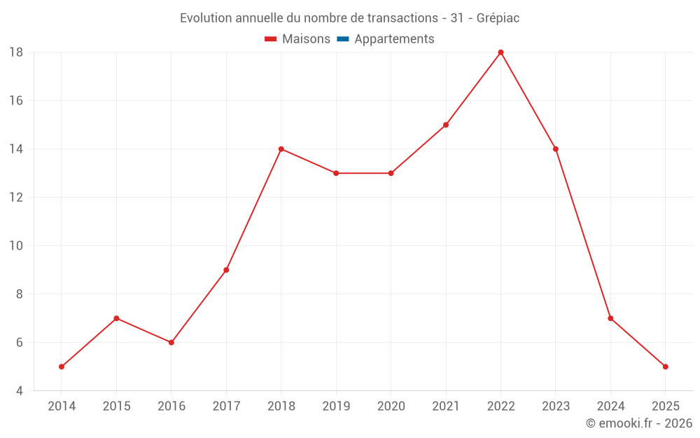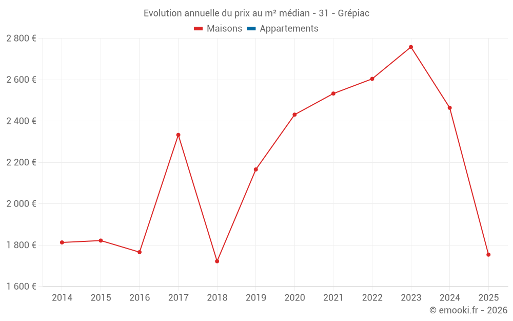 Le prix médian sur les 16 transactions de maisons des 24 derniers mois dans la commune de Grépiac était de 2 285 € par mètre carré pour une valeur foncière médiane de 240 000 €. Sur cette période 60% des transactions se sont situées entre 1 729 et 3 025 € par mètre carré (du 2ème au 8ème déciles).