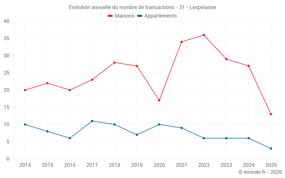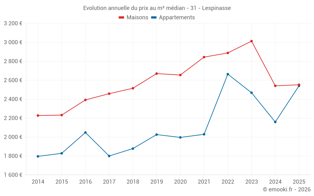 Le prix médian sur les 28 transactions de maisons des 12 derniers mois dans la commune de Lespinasse était de 2 520 € par mètre carré pour une valeur foncière médiane de 211 358 €. Sur cette période 60% des transactions se sont situées entre 2 457 et 2 921 € par mètre carré (du 2ème au 8ème déciles).
