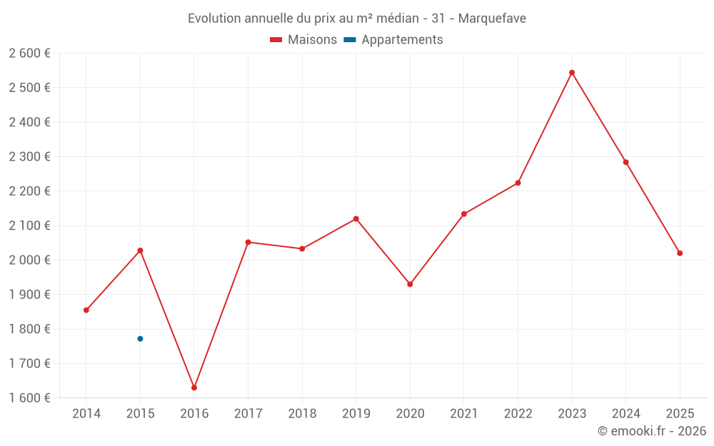 Le prix médian sur les 17 transactions de maisons des 24 derniers mois dans la commune de Marquefave était de 2 311 € par mètre carré pour une valeur foncière médiane de 258 000 €. Sur cette période 60% des transactions se sont situées entre 2 029 et 2 590 € par mètre carré (du 2ème au 8ème déciles).
