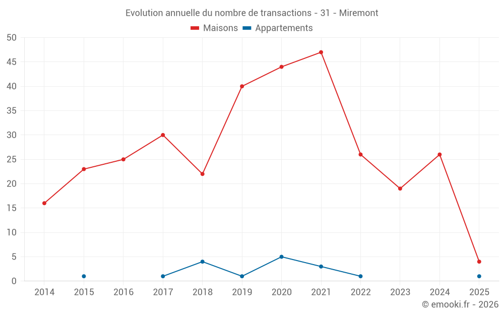 Le prix médian sur les 22 transactions de maisons des 12 derniers mois dans la commune de Miremont était de 2 624 € par mètre carré pour une valeur foncière médiane de 231 500 €. Sur cette période 60% des transactions se sont situées entre 1 815 et 3 037 € par mètre carré (du 2ème au 8ème déciles).
