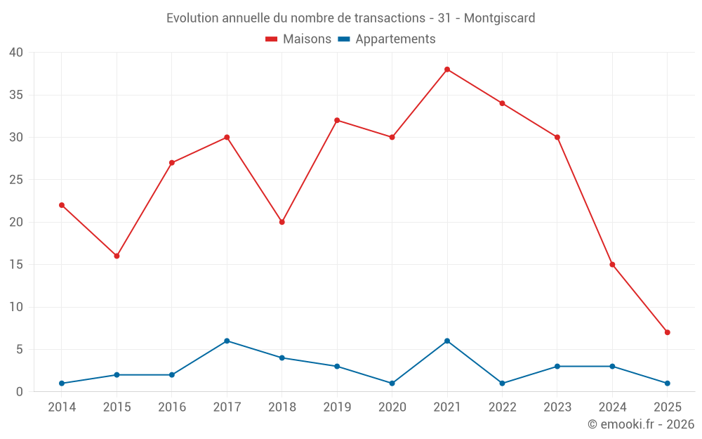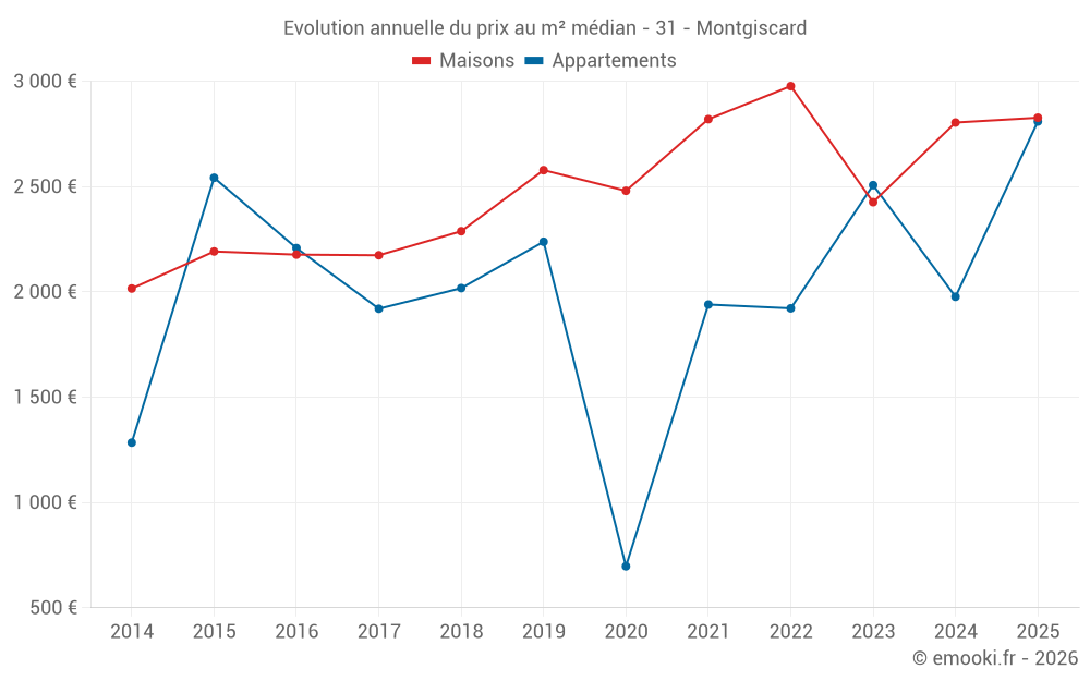 Le prix médian sur les 39 transactions de maisons des 24 derniers mois dans la commune de Montgiscard était de 2 804 € par mètre carré pour une valeur foncière médiane de 260 650 €. Sur cette période 60% des transactions se sont situées entre 2 078 et 3 372 € par mètre carré (du 2ème au 8ème déciles).