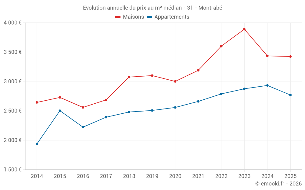 Le prix médian sur les 27 transactions de maisons des 12 derniers mois dans la commune de Montrabé était de 3 423 € par mètre carré pour une valeur foncière médiane de 400 000 €. Sur cette période 60% des transactions se sont situées entre 3 024 et 3 718 € par mètre carré (du 2ème au 8ème déciles).