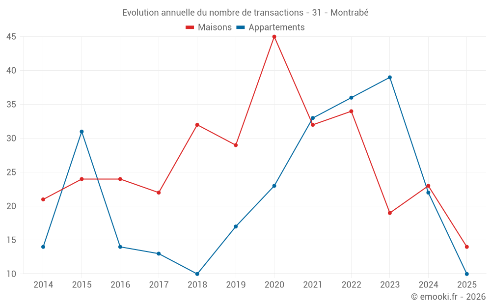 Le prix médian sur les 23 transactions d'appartements des 12 derniers mois dans la commune de Montrabé était de 2 858 € par mètre carré pour une valeur foncière médiane de 151 100 €. Sur cette période 60% des transactions se sont situées entre 2 487 et 3 060 € par mètre carré (du 2ème au 8ème déciles).