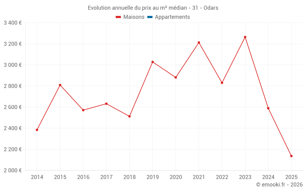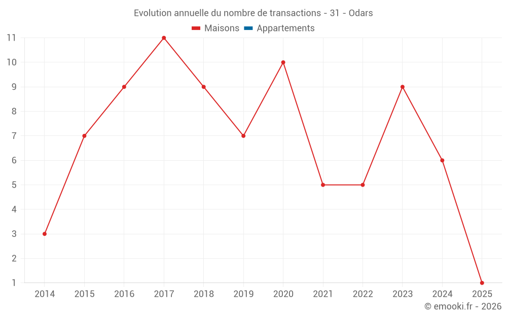 Le prix médian sur les 16 transactions de maisons des 24 derniers mois dans la commune d'Odars était de 2 890 € par mètre carré pour une valeur foncière médiane de 342 750 €. Sur cette période 60% des transactions se sont situées entre 1 711 et 3 626 € par mètre carré (du 2ème au 8ème déciles).