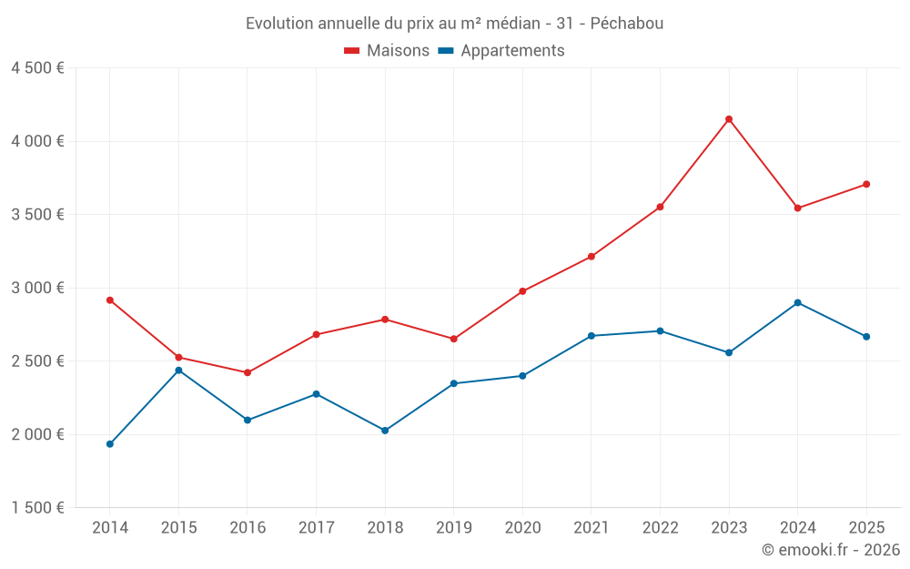 Le prix médian sur les 24 transactions de maisons des 24 derniers mois dans la commune de Péchabou était de 3 591 € par mètre carré pour une valeur foncière médiane de 335 644 €. Sur cette période 60% des transactions se sont situées entre 3 110 et 4 086 € par mètre carré (du 2ème au 8ème déciles).